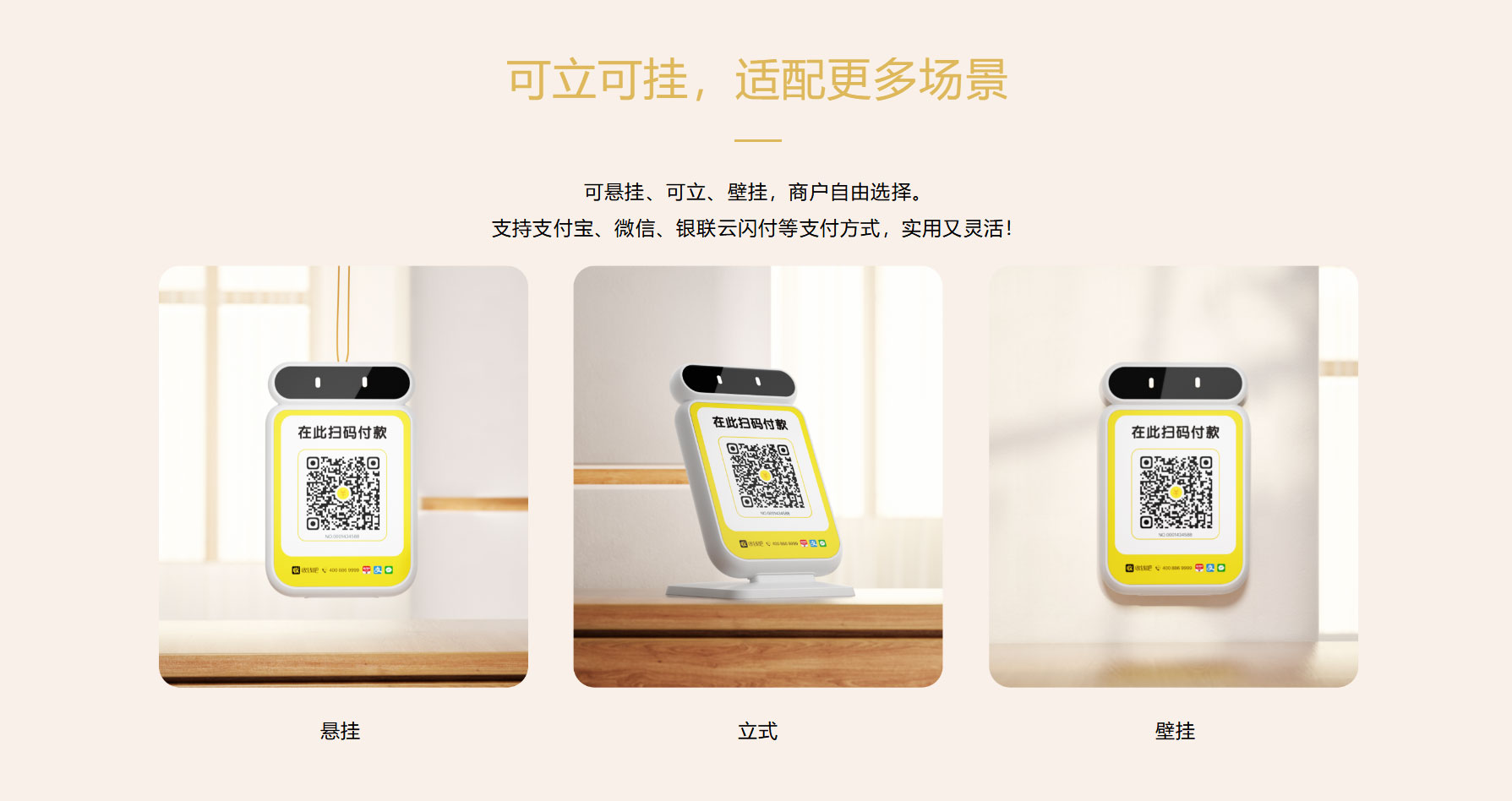 可悬挂、可立、壁挂,商户自由选择。